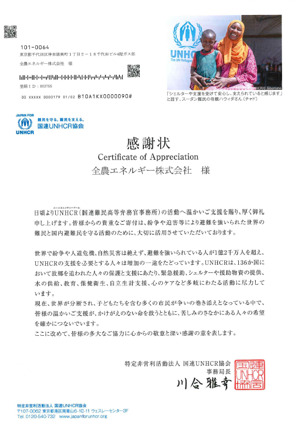 SDGsの取り組みの一環として、ガス器具販売の売上の一部を国連UNHCR協会へ寄付致しました。今後も引き続き取り組んでいきます。